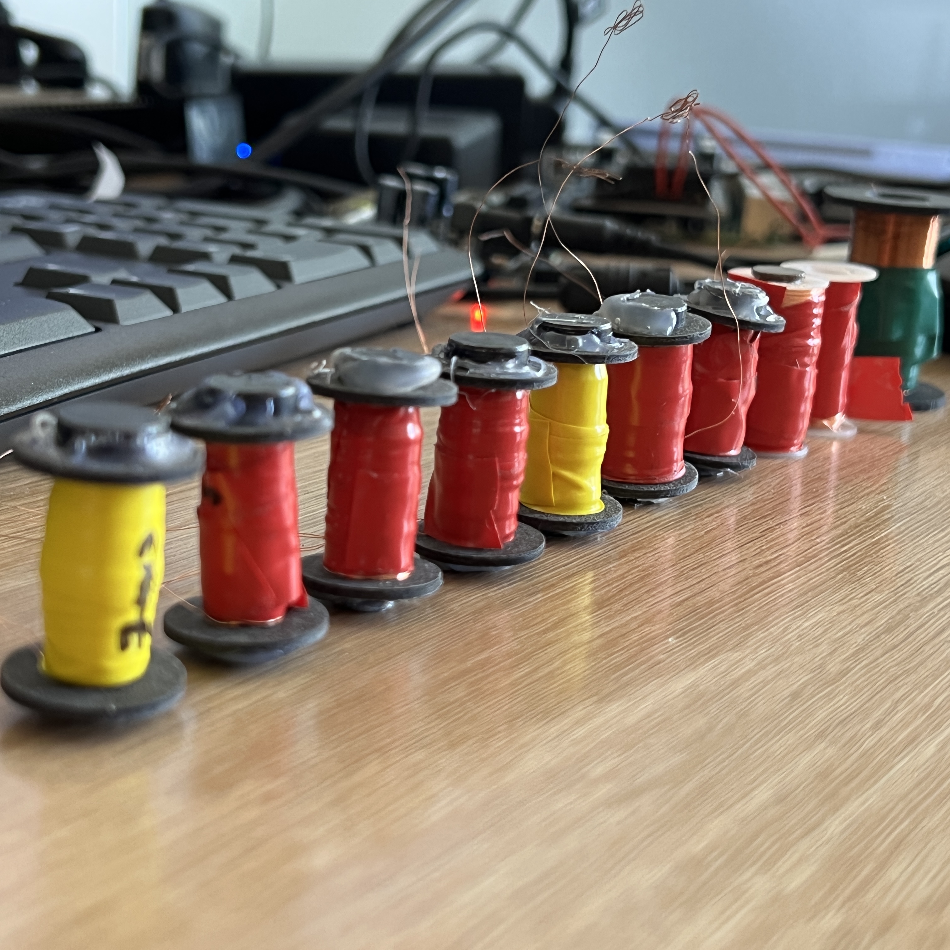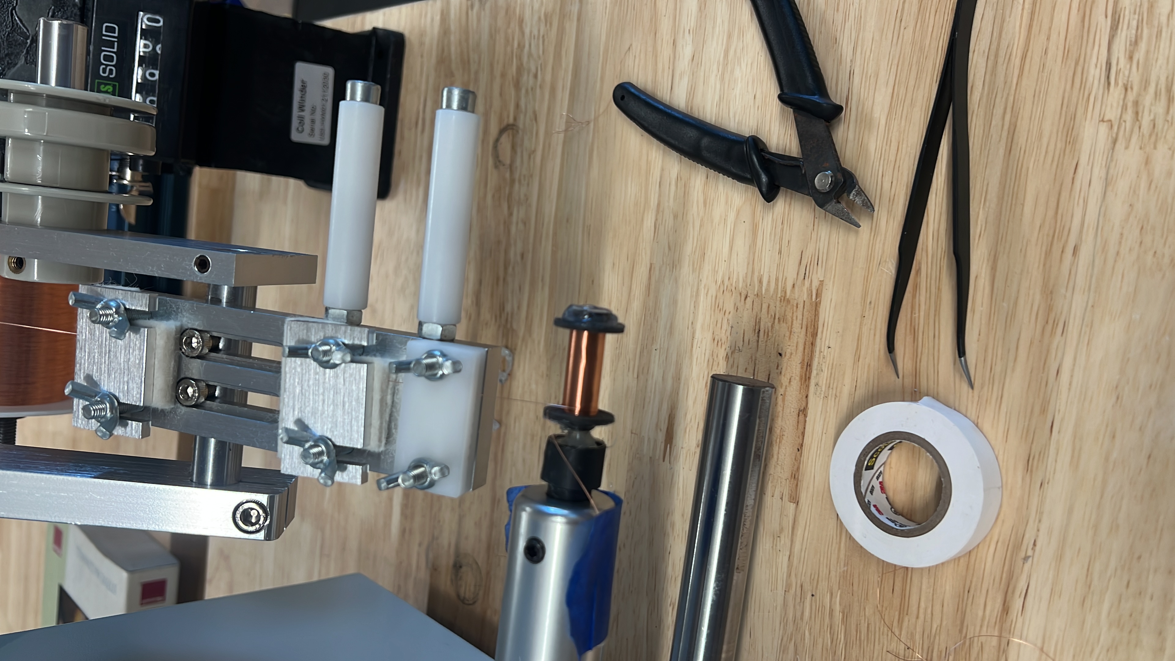 For the electromagnet, we tested a combination of different number of turns, and finally went with a coil with 700 turns made with 34AWG copper wire. The coil (after winding) has a length of 22.6mm, and a diameter of 8mm with a resistance of ~20.7ohms. We use a ferromagnetic core.