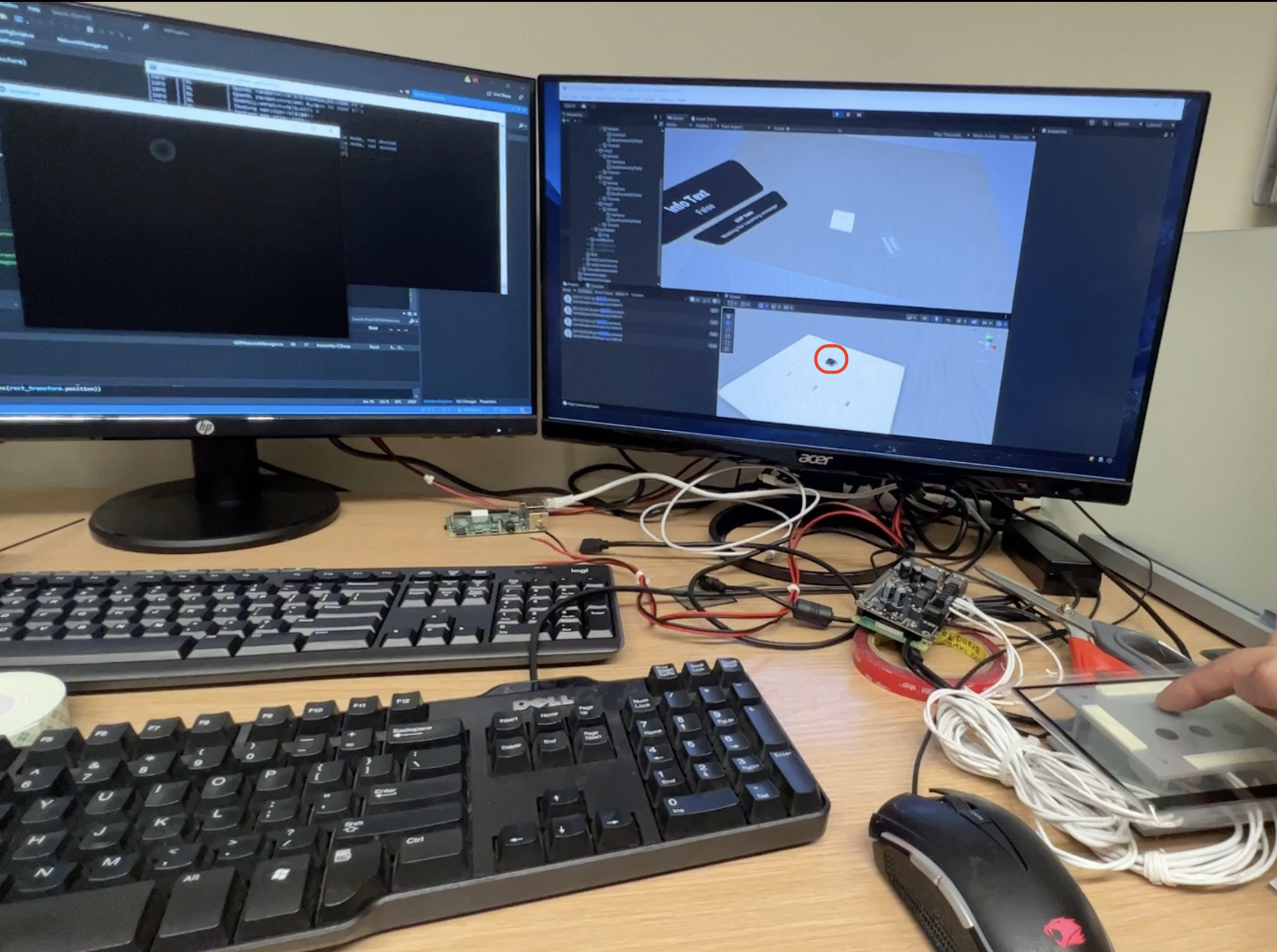 b. Capacitive touch screen interface. 2D signals $(x,y)$ from this are fed to the VR environment to show precise position of user’s interaction (see figure 2) - HiFiberry - RasPi interface to generate PWM signals for controlling localised activation of electromagnets. We are using Hifiberry (AMP2 + raspberry) * 2 as 4 channels output to drive the current setup.